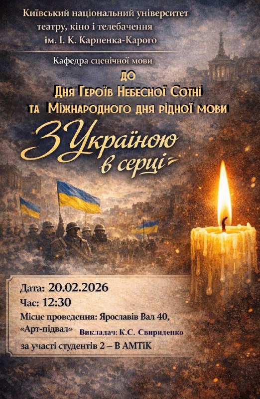 Шановні колеги, Продакшен-студія Polygon Film має честь запросити викладачів та інших представників Київського національного університету театру, кіно і телебачення імені І. К. Карпенка-Карого на спеціальний допрем’єрний показ документального фільму «Головний герой», який відбудеться 6 лютого 2026 року о 18:00 у Червоній залі Будинку кіно за адресою: вул. Саксаганського, 6, м. Київ. Вхід відкрито з 17:30. Фільм створений режисером Мироном […]