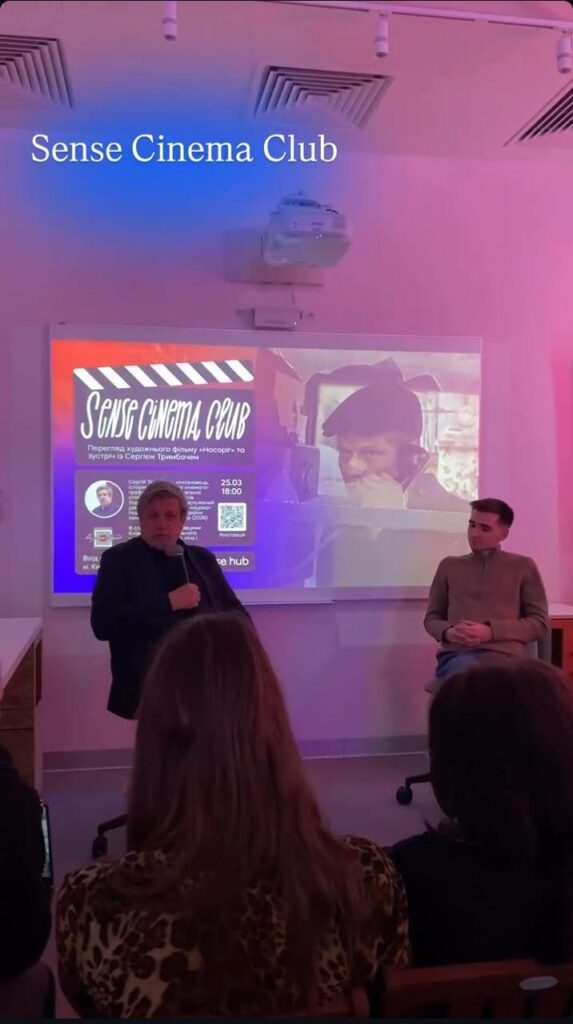 25 березня при повному залі в Sense Hub Kyiv відбувся показ фільму Олега Сенцова «Носоріг», після якого пройшла змістовна розмова з кінознавцем, цьогорічним лауреатом Національної премії імені Тараса Шевченка Сергієм Тримбачем. Дискусія, модерована кінознавцями КНУТКіТ імені І. К. Карпенка-Карого Олегом Зозулею та Владиславом Бебешком, вийшла далеко за межі обговорення самого фільму і перетворилась на спробу осмислити 1990-ті як травматичний і водночас визначальний період для українського суспільства та кіно.