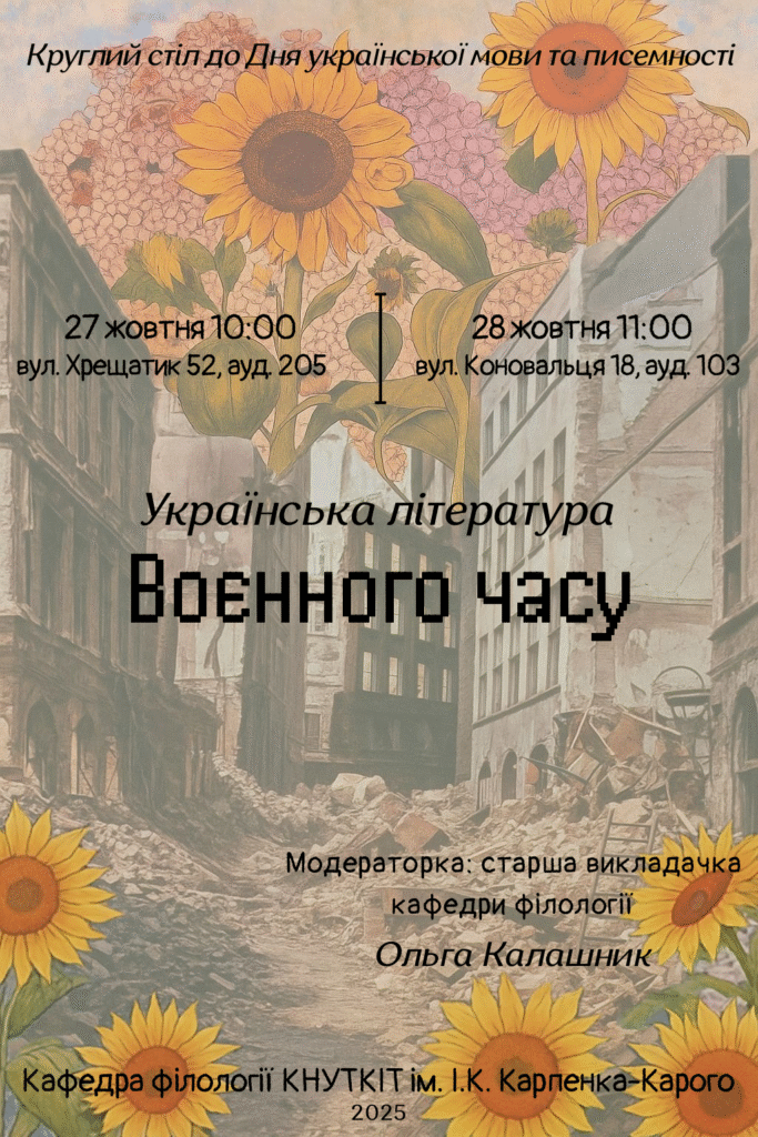 27 і 28 жовтня 2025 року на театральному факультеті та в стінах Інституту екранних мистецтв КНУТКіТ ім. І. К. Карпенка-Карого відбувся круглий стіл-семінар «Українська література воєнного часу», організований і модерований старшою викладачкою кафедри філології Ольгою Калашник.