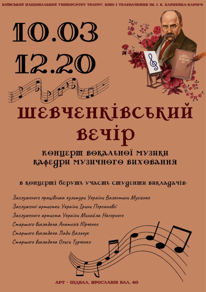 Кафедра музичного виховання запрошує на концерт вокальної музики «Шевченківський вечір», що відбудеться 10.03.2026 о 12.20 у приміщенні Арт-підвалу КНУТКІТ ім. І. К. Карпенка-Карого.