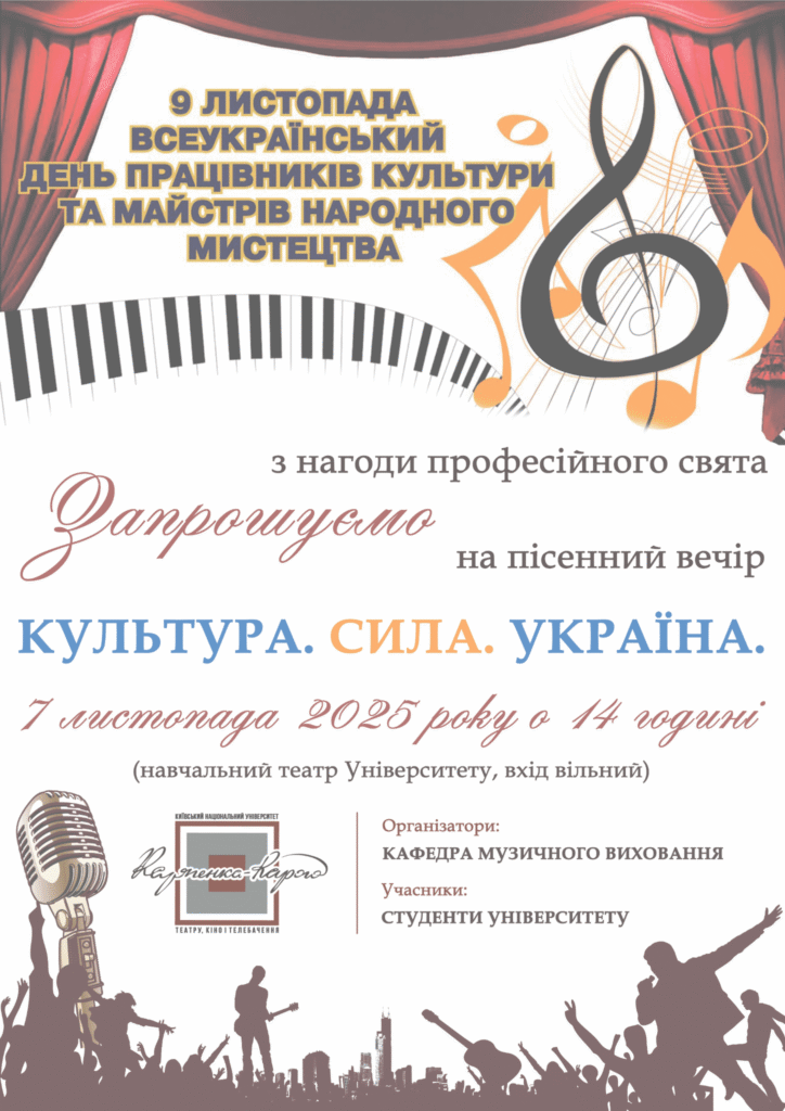 У час, коли країна проходить через складні випробування, саме мистецтво допомагає зберегти гідність, віру та душевну рівновагу. Саме тому у цей день в навчальному театрі Університету відбудеться пісенний вечір «КУЛЬТУРА. СИЛА. УКРАЇНА», присвячений Дню працівників культури та майстрів народного мистецтва України.