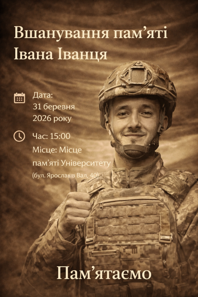 31 березня 2026 року в Київському національному університеті театру, кіно і телебачення імені І.К. Карпенка-Карого відбудеться церемонія вшанування пам’яті випускника Університету Івана Івановича Іванця, який загинув 26 лютого 2026 року під час виконання бойового завдання, захищаючи Україну.