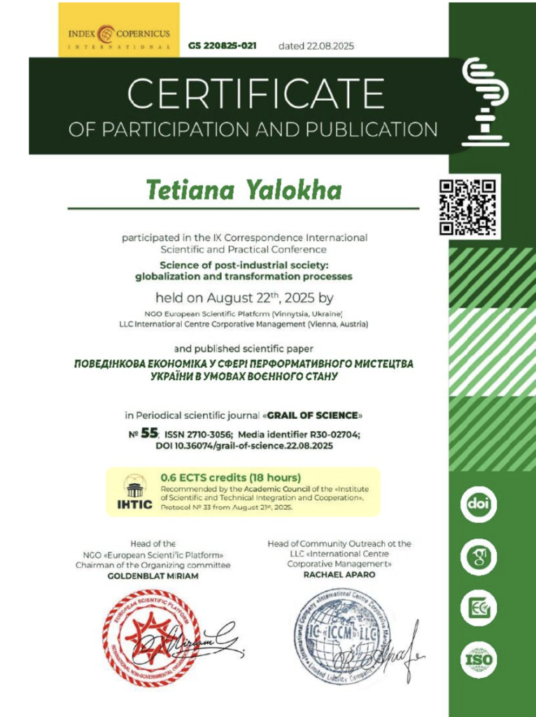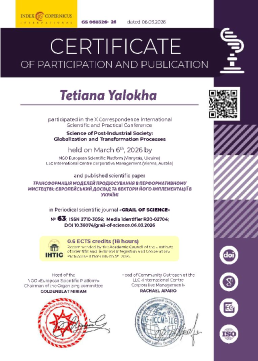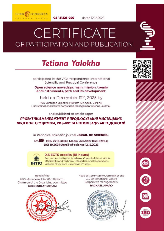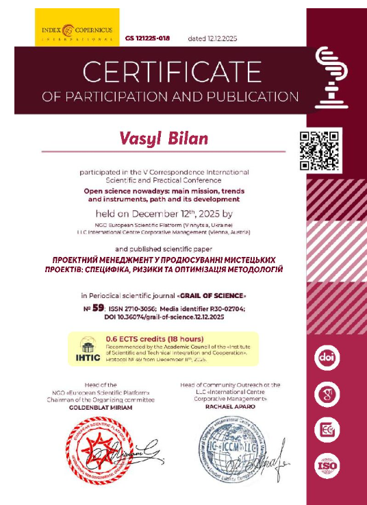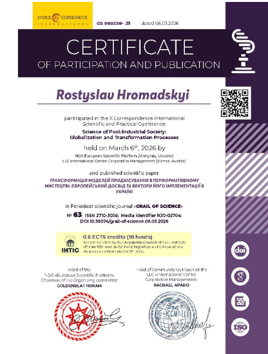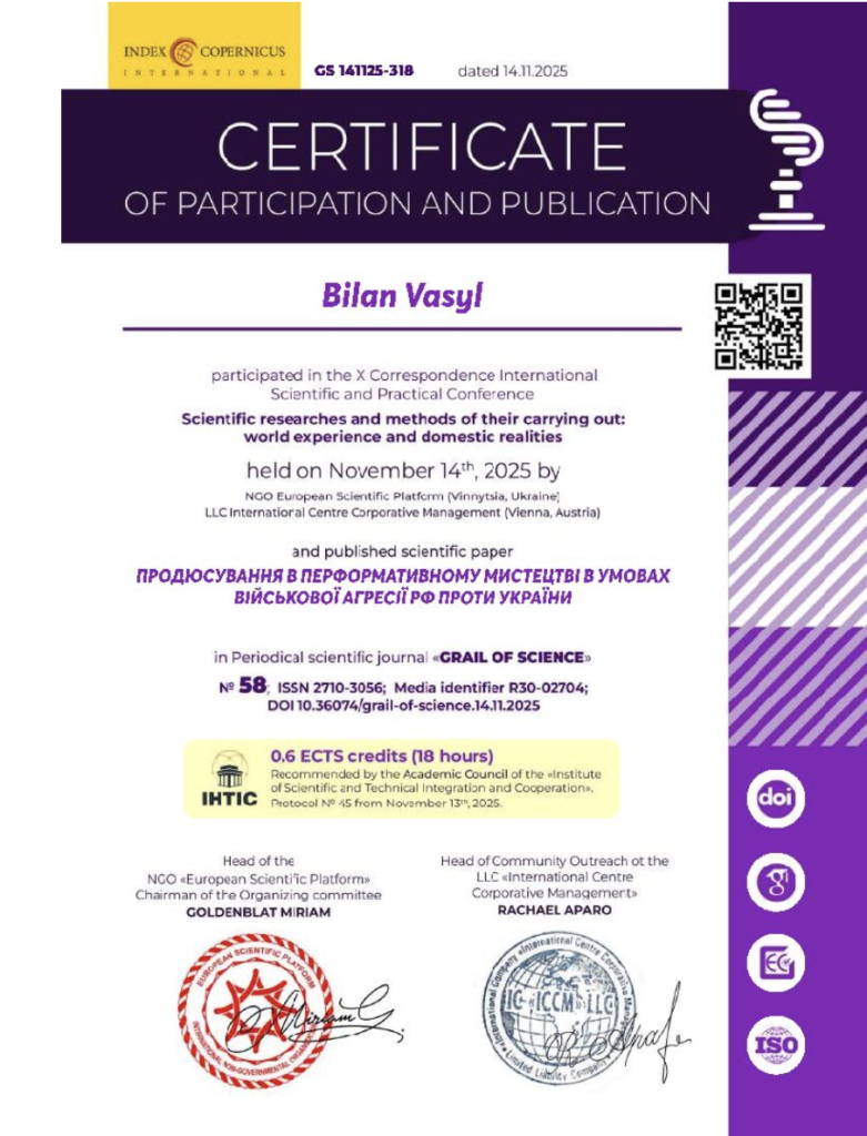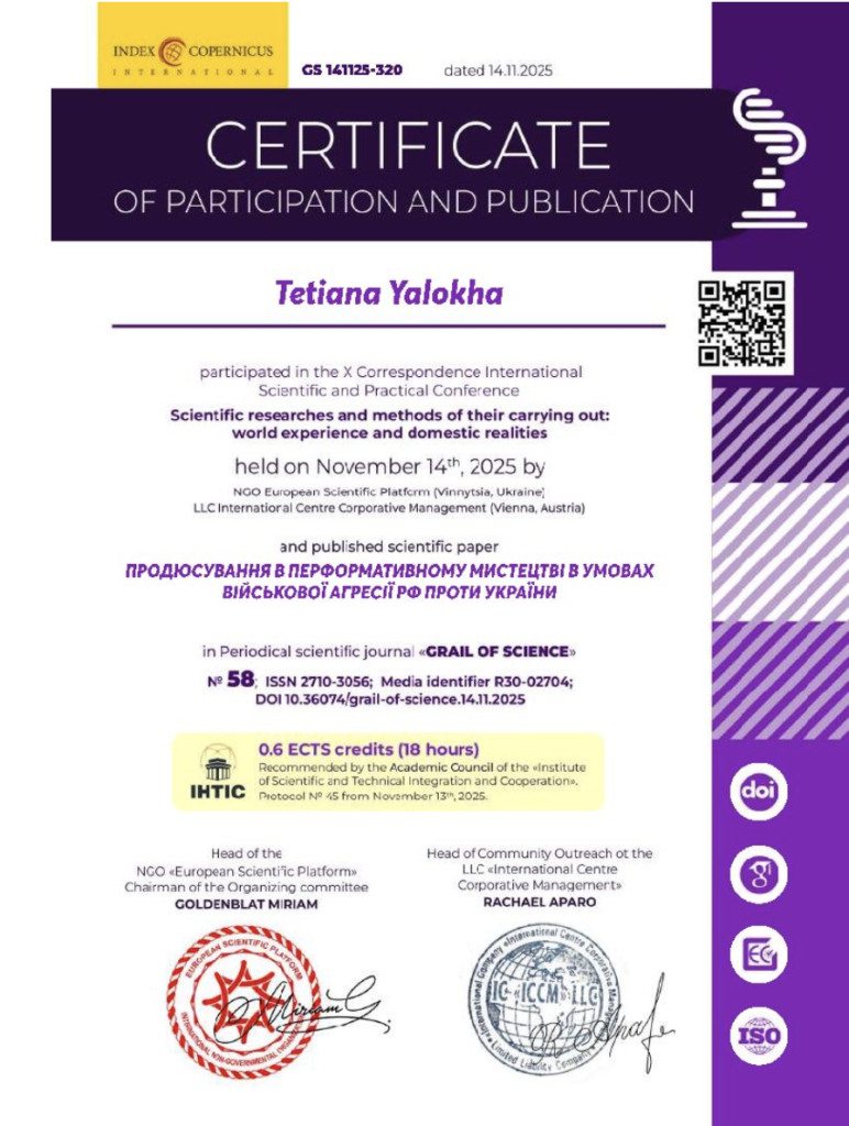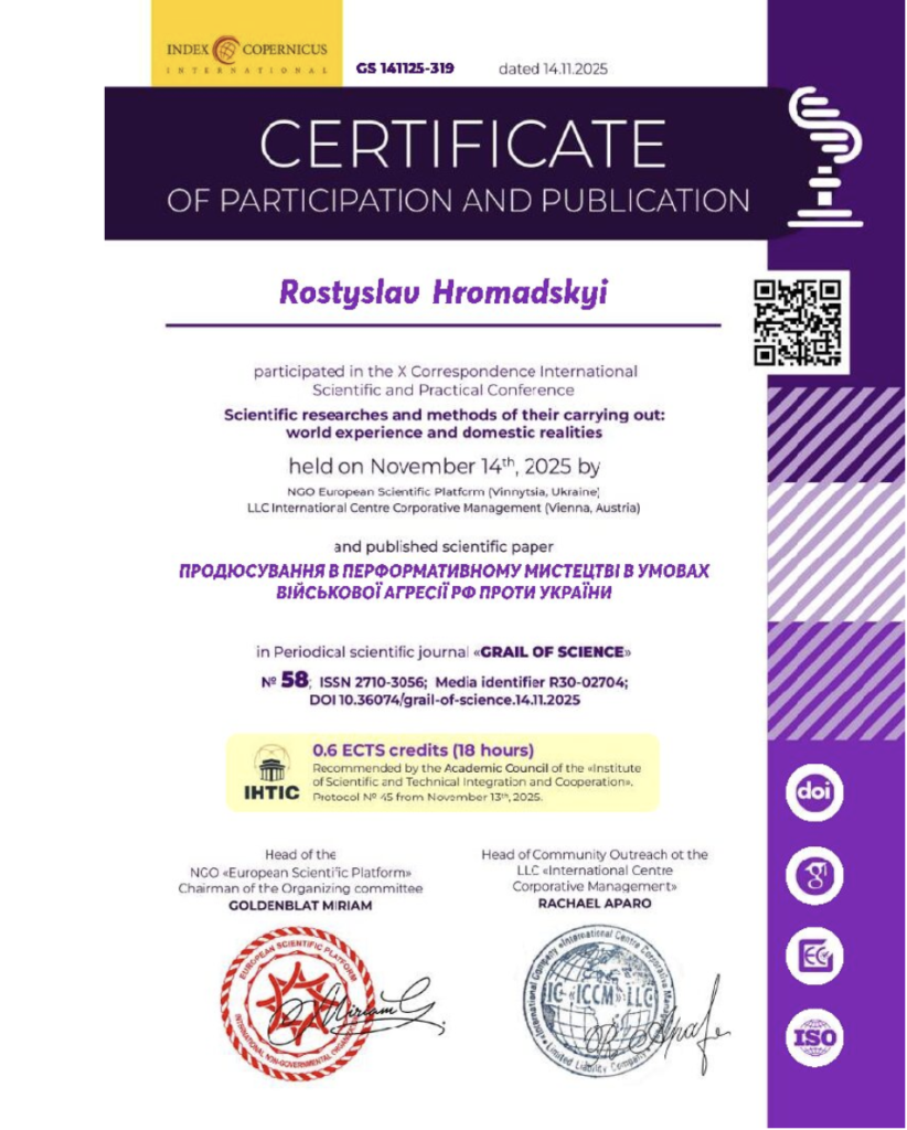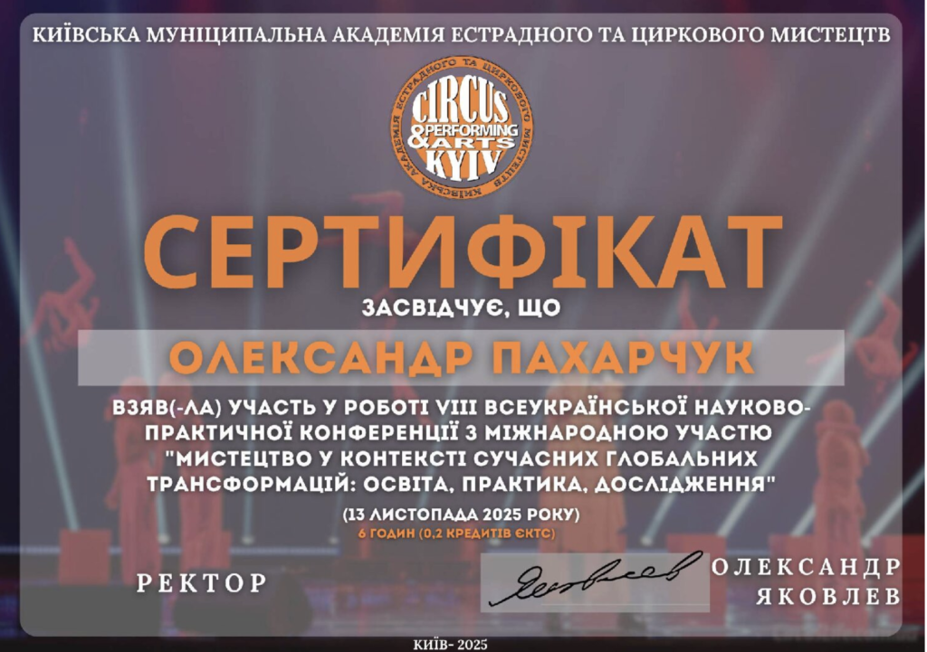 Структура 🢒 Сертифікати участі у наукових заходах кафедри організації театральної справи імені І. Д. Безгіна