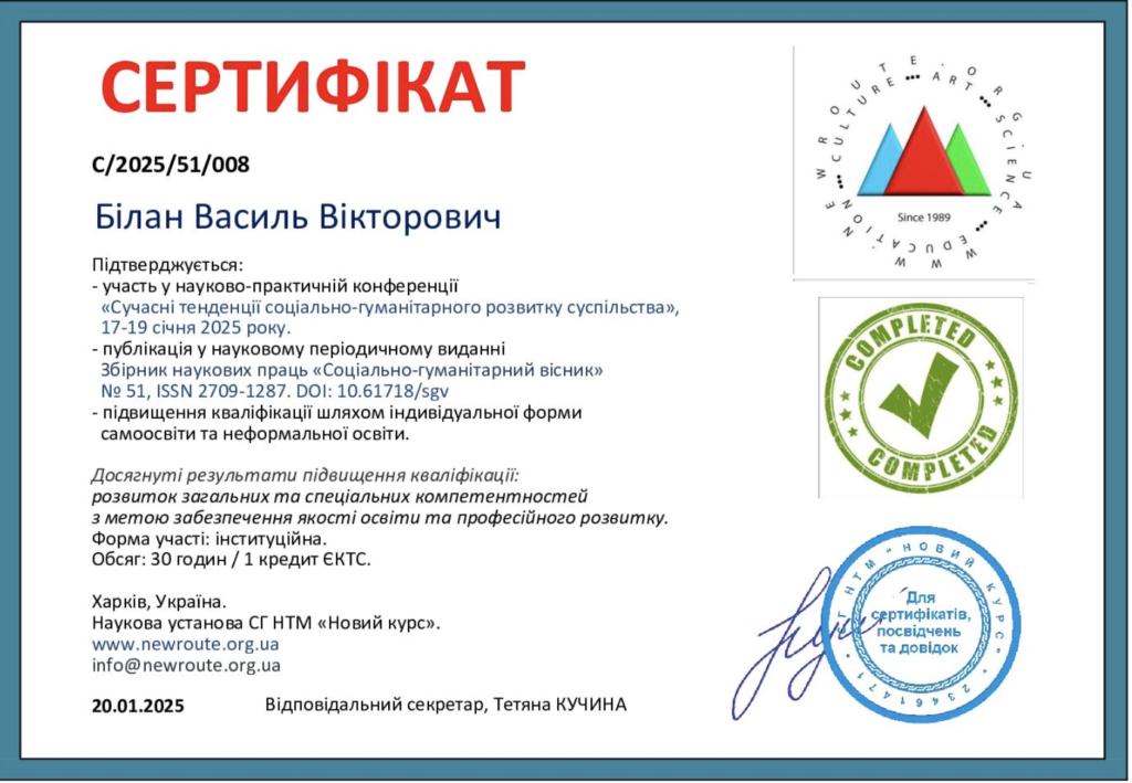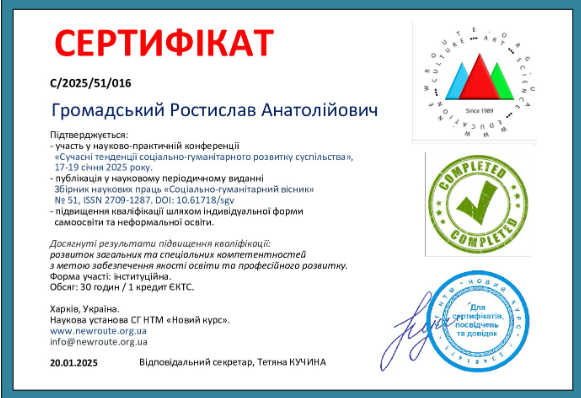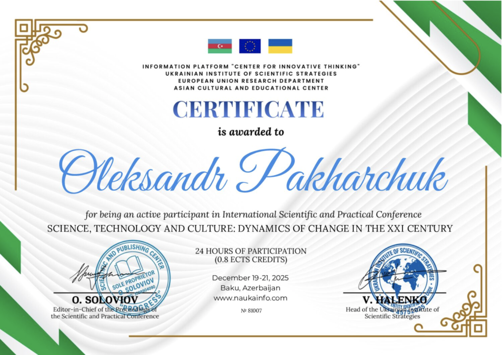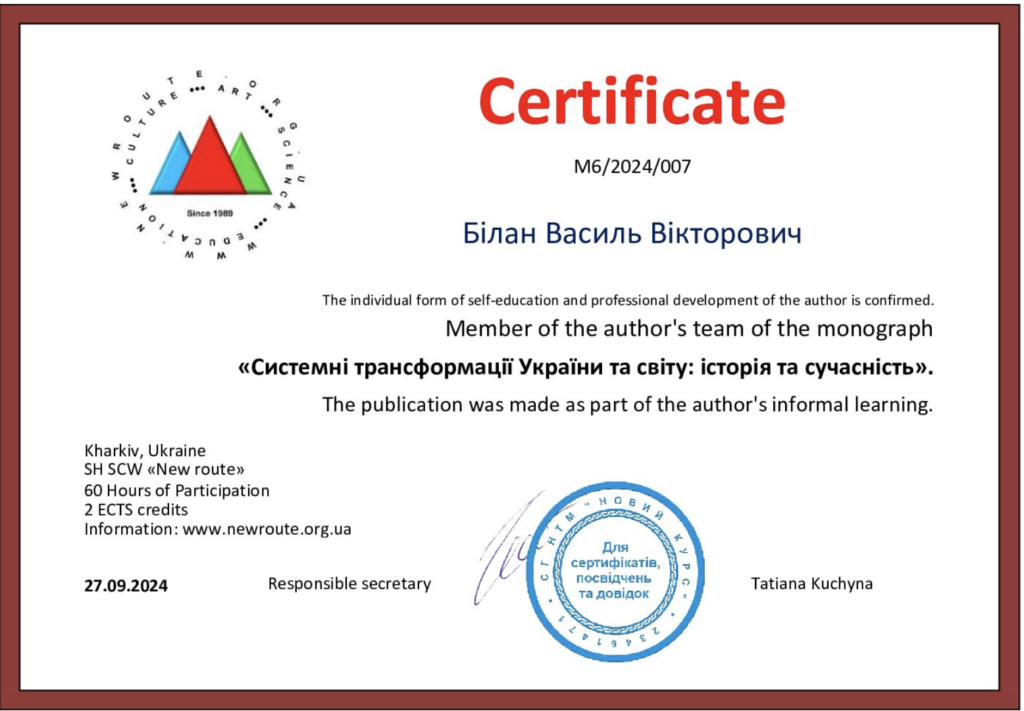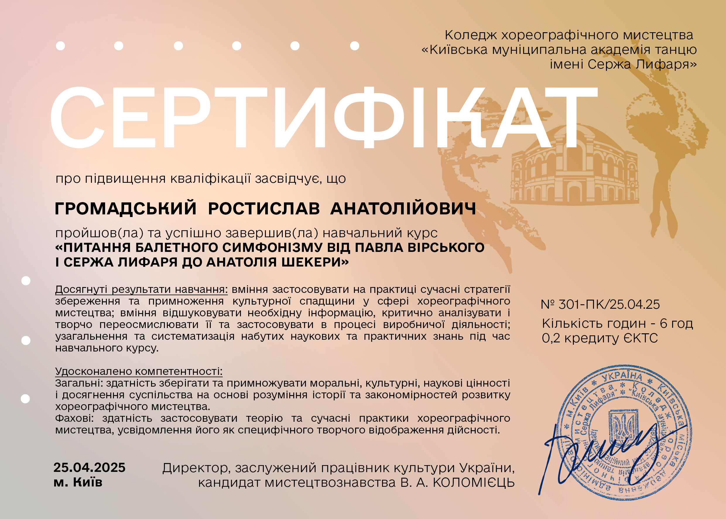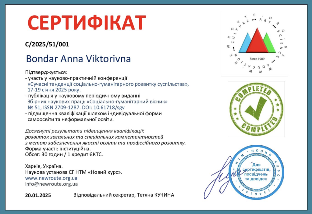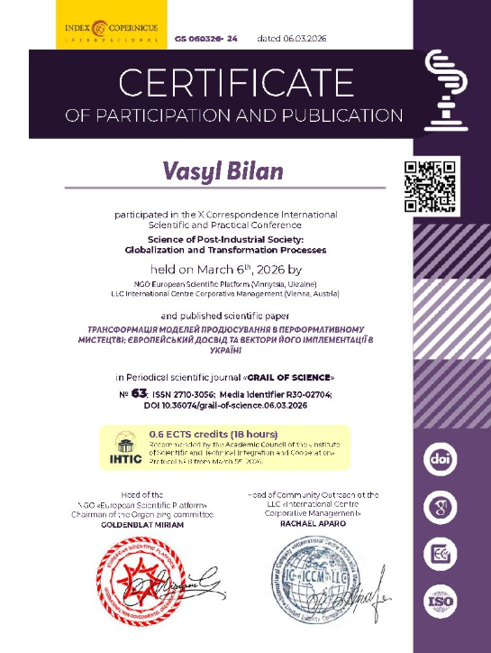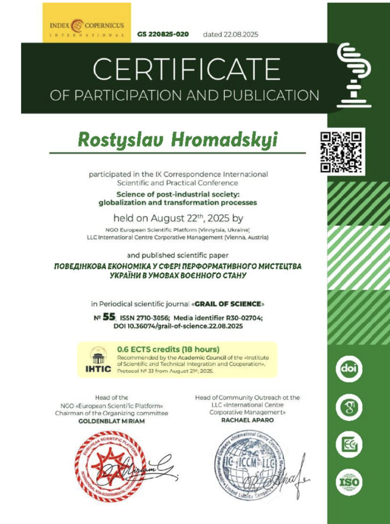 Структура 🢒 Сертифікати участі у наукових заходах кафедри організації театральної справи імені І. Д. Безгіна