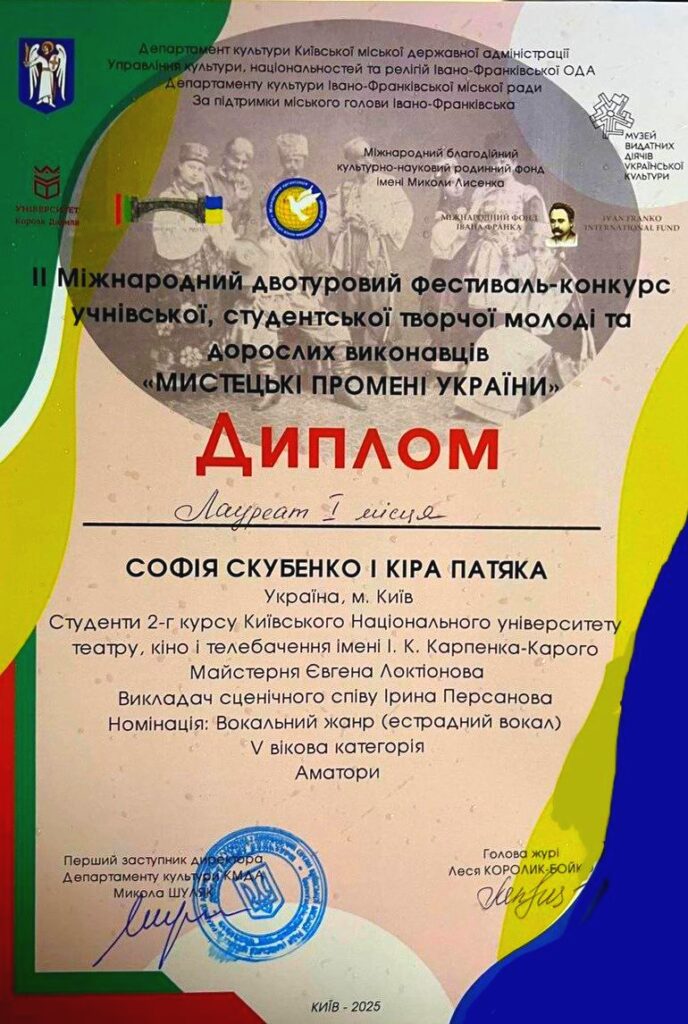 Студентки Київського національного університету театру, кіно і телебачення імені І. К. Карпенка-Карого, Софія Скубенко та Кіра Патяка, — здобувачки ІІ курсу ОПП «Акторське мистецтво театру і кіно» майстерні заслуженого артиста України Євгена Локтіонова, — стали лауреатами Першої премії фестивалю-конкурсу!