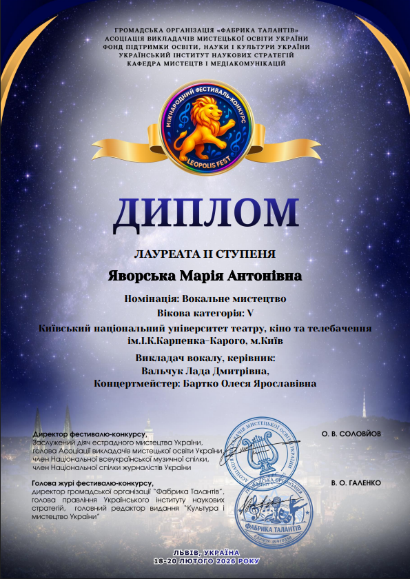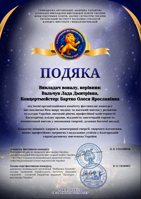 18-20 лютого у місті Львові у дистанційному форматі відбувся Міжнародний фестиваль-конкурс мистецтв Leopolis Fest, організований Громадською організацією «Фабрика талантів», Асоціацією викладачів мистецької освіти України, Фонду підтримки освіти, науки і культури України та Українським інститутом наукових стратегій. Конкурс має на меті підтримку обдарованих учнів та молоді, розвиток їхніх індивідуальних здібностей, а також формування естетичного смаку, культурної ідентичності та поваги до мистецької спадщини.